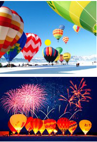 真っ白な雪原にカラフルな熱気球が浮かび、小千谷に春を告げる風物詩「おぢや風船一揆」。