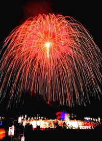 両日あげられる四尺玉は約800メートルの高さに打ち上げられ、直径約800メートルの大輪が咲き誇ります。