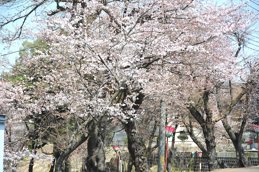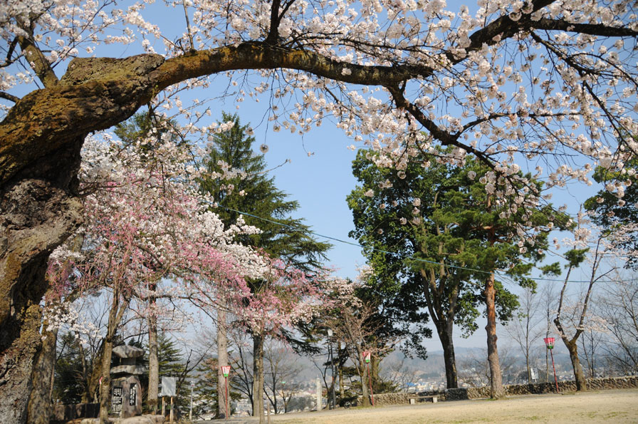 その昔、シンチ城があった信濃川沿いの高台です。信濃川河畔に流れ落ちるように咲き誇る桜を間近で見ることができます。ゆっくりと流れる信濃川をバックに写真を撮るのもおススメです。
