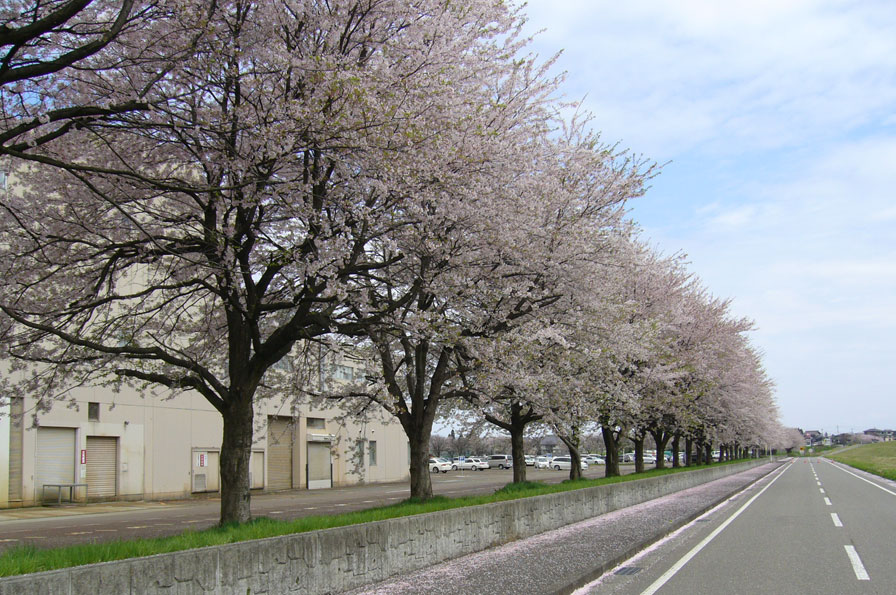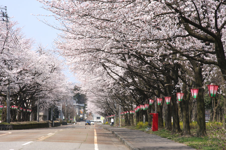 小千谷を流れる信濃川河川敷に総延長1.5Kmの桜並木が続いています。温かい陽気の中、河川敷沿いをお散歩しながらのんびりと桜を眺めるのがオススメです。