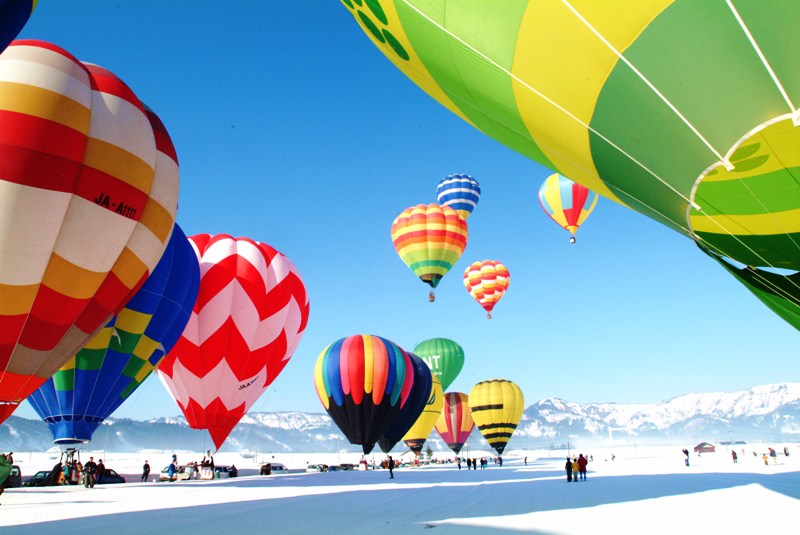 真っ白な雪原にカラフルな熱気球が浮かび、小千谷に春を告げる風物詩「おぢや風船一揆」。日本を代表する熱気球大会「日本海カップクロスカントリー選手権」兼ねています。