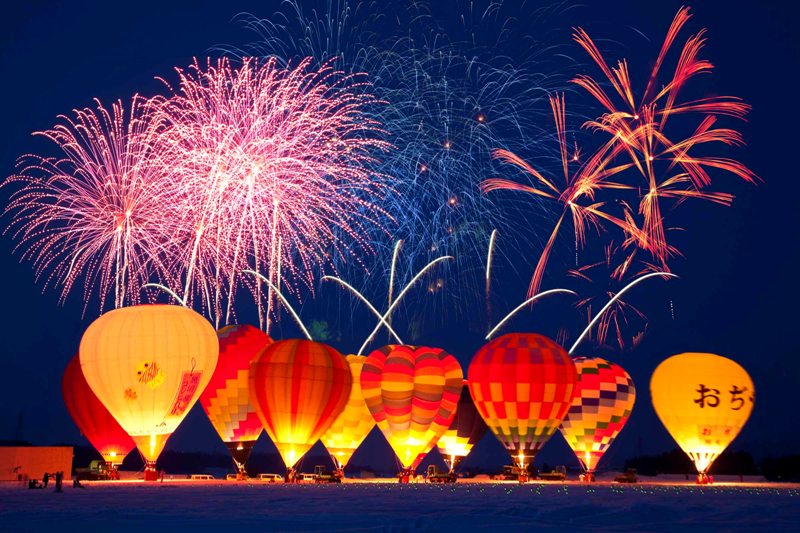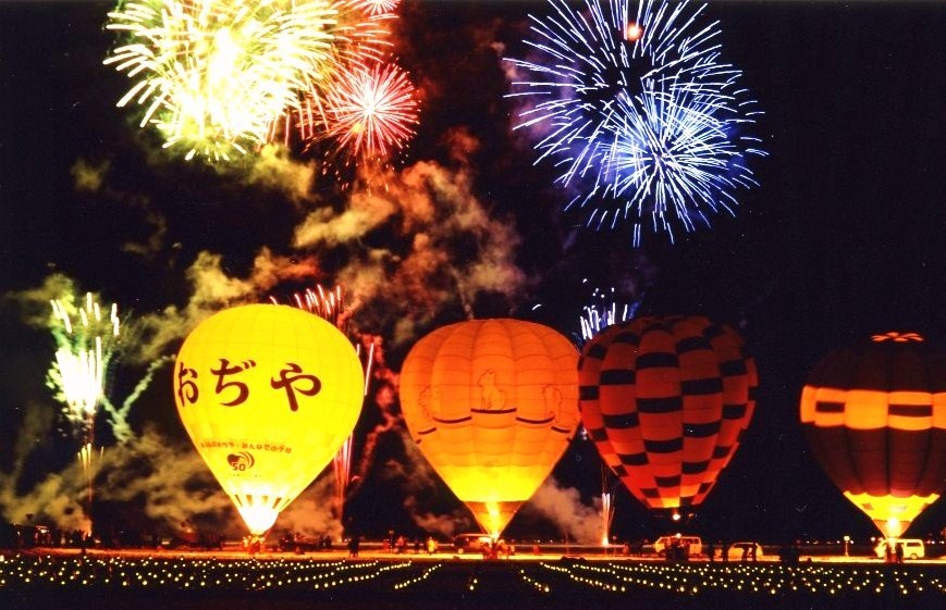 夜は熱気球にバーナーで光を灯すグローバルーンと、打ち上げ花火の共演です。幻想的な世界に惹き込まれます。