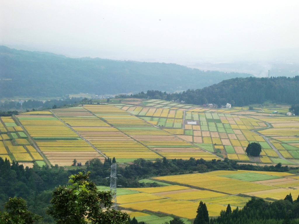 秋になると、稲刈り前の黄金色に輝く田んぼ、稲刈りを終えた田んぼ、真っ白な花が咲くそば畑が、まるでパッチワークのような風景を眼下に見ることができます。